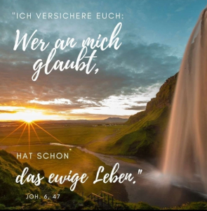 Johannes 3,16: “Denn so hat Gott die Welt geliebt, daß er seinen eingeborenen Sohn gab, damit jeder, der an ihn glaubt, nicht verlorengeht, sondern ewiges Leben hat.”