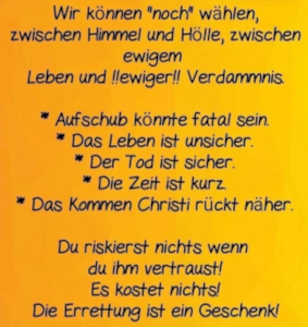 Wenn du heute sterben würdest, wo würdest du die Ewigkeit verbringen? Die Bibel sagt, dass es entweder im Himmel sein wird oder in der Hölle. Machst du dir da auch deine Gedanken darüber? Hier findest du die Antwort!